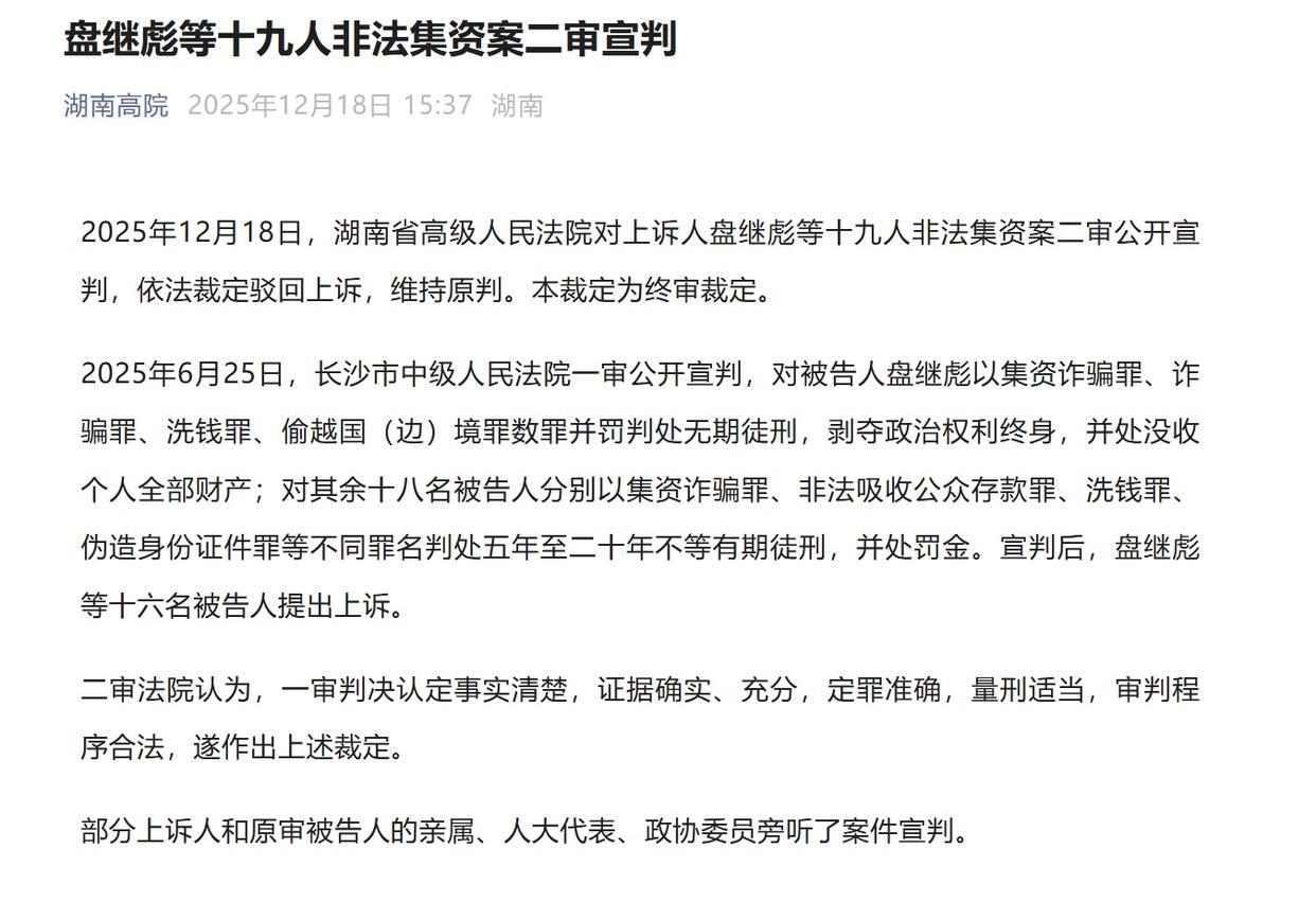 2025年12月18日,湖南省高级人民法院对上诉人盘继彪等十九人非法集资案二审公开宣判,依法裁定驳回上诉,维持原判。本裁定为终审裁定。